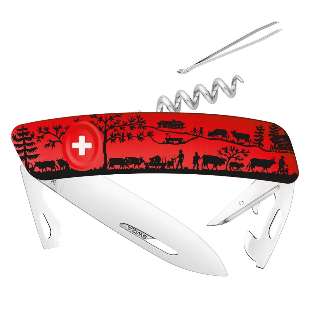 The Swiza D03 Heimat Swiss Pocket Knife features a traditional Swiss design on one side. This black and white pattern named “heimat”, which is German for “home,” depicts a Swiss country farm scene created in the style of “scherenschnitte,” or paper cutting art on a Swiss red background.