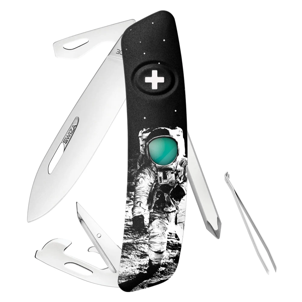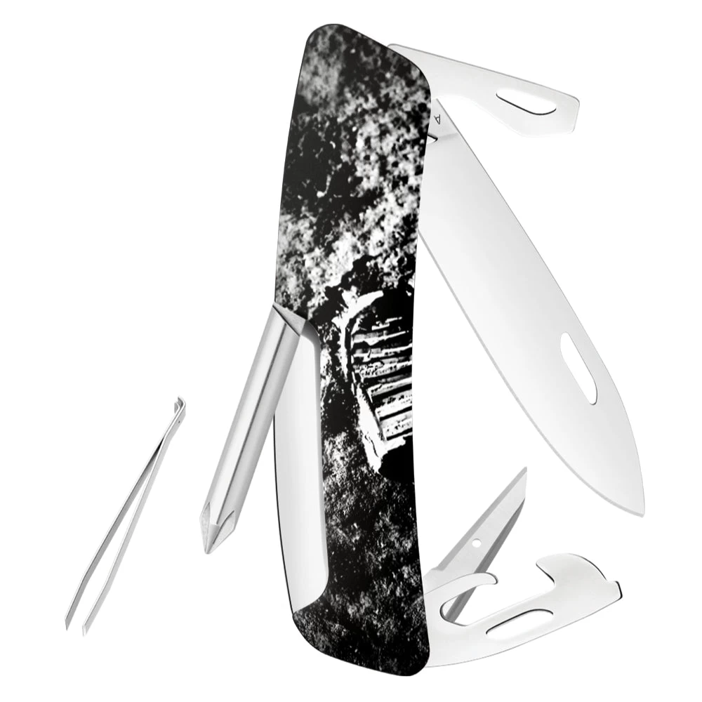 The Swiza D04 Moonwalk 50 Swiss Pocket Knife is an authentic Swiss Knife with a bold design celebrating the 50th anniversary of man’s first steps on the moon, which took place on July 21, 1969 when astronaut Neil Armstrong set foot on the lunar surface, followed by Buzz Aldrin shortly thereafter. An astronaut takes a step on the moon on the front of this collectible knife, and an iconic moon footstep is printed on the back.