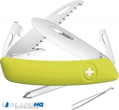 This Swiza J06 pocket knife offers a revolutionary redesign of the traditional Swiss pocket knife. It features a soft touch polymer handle with a rubberized texture for a sure grip in difficult conditions. The blade is made from 440 stainless steel with a polished satin finish. It locks in place with a liner lock mechanism that is easily released by pressing the Swiza cross button.