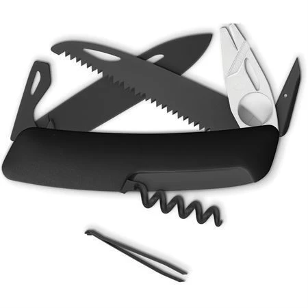 - Tools include: Bottle opener l Screwdriver tip l Blade with safety lock l Saw blade l Reamer with sewing eye l Corkscrew l Tweezers I Tick tool