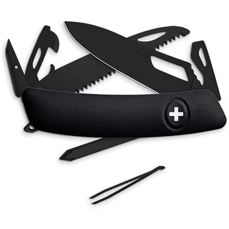 - Tools include: Blade with safety lock l Tweezers l Phillips screwdriver l Keyring l Reamer with sewing eye l Bottle opener l Screwdriver tip l Can opener l Saw blade