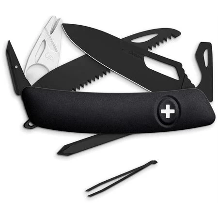 Model – SZAS1031010. Swiza S1031010 – Single Hand Swiss Knife. 3.75″ (9.53cm) closed. Black coated blade. Black rubberized ABS handle. Tools include: Blade with safety lock l Saw blade l Reamer with sewing eye l Magnifying lens l Bottle opener l Screwdriver tip l Corkscrew l Keyring l Tweezers l Phillips screwdriver. Tick tool. Boxed. Made in Switzerland.